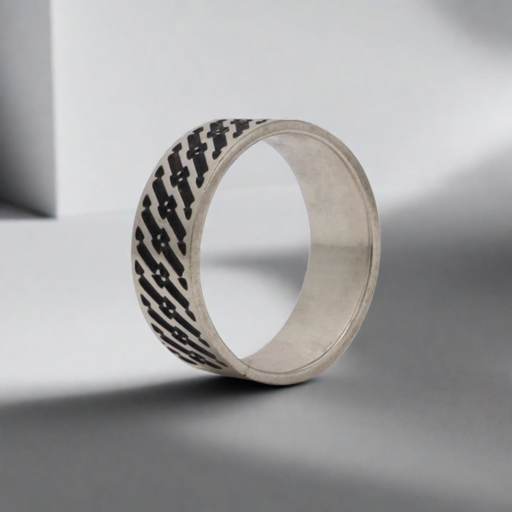 Our Abstract Design Ring is a 7mm wide band style ring in Sterling Silver with an abstract pattern etched on the outside surface.