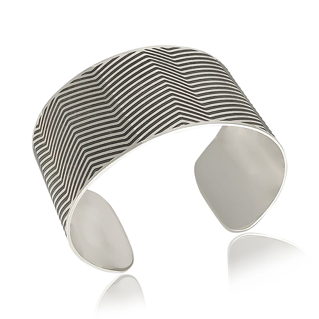 With a confident air of elegant luxury, this exclusive piece is handcrafted from sterling silver and bears a distinguished UK hallmark. This minimalist piece also features uneven lines and a black patina oxidization for added sophistication.